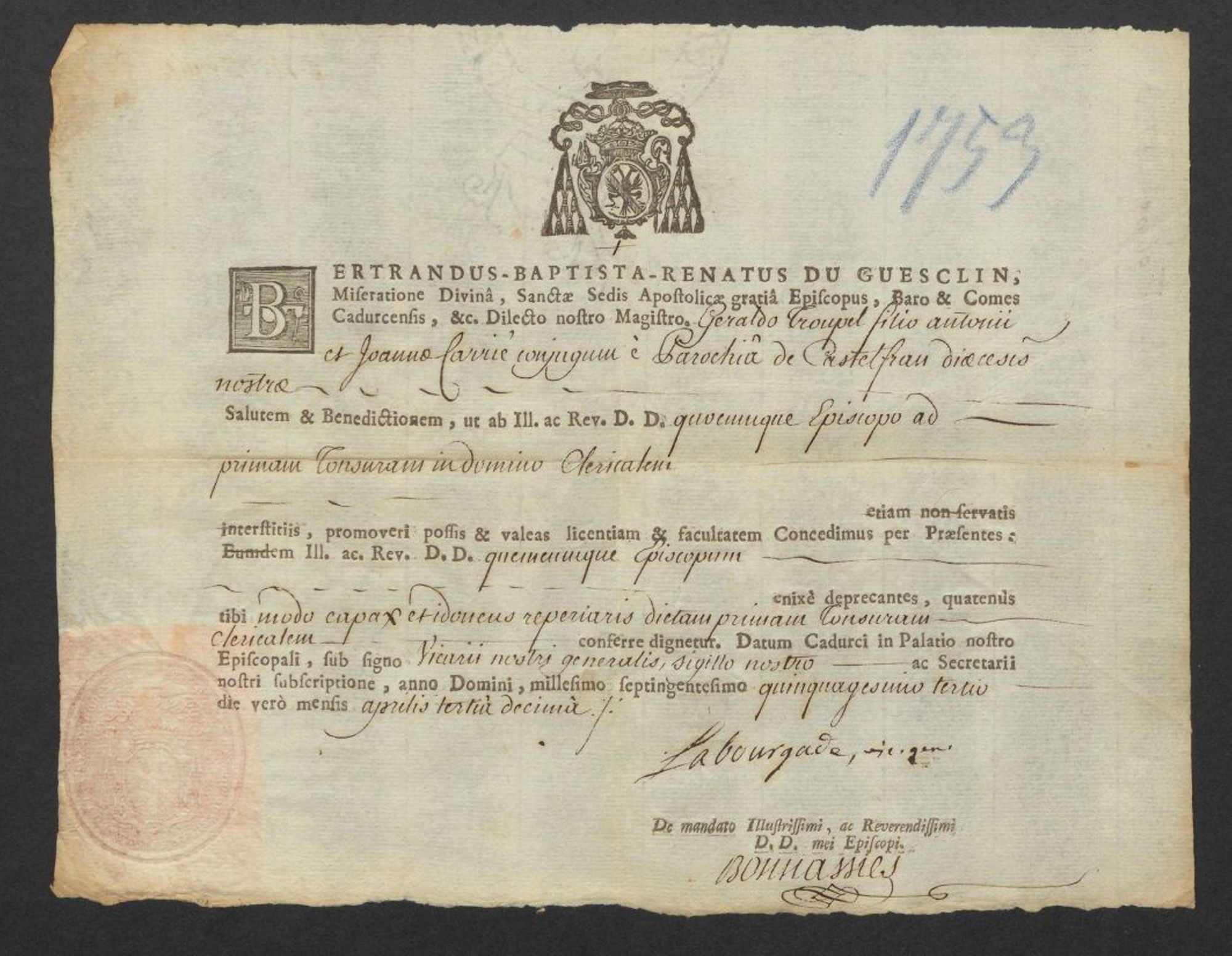 Pour le XVIIe siècle, un complément important à la série G (G 26 à 156) se trouve dans le groupe de fonds entrés en 2015 et maintenus réunis dans un instrument de recherche particulier : « La vie et l’œuvre d’Alain de Sominihac (1593-1659), comte-évêque de Cahors et abbé de Chancelade » consultable en salle de recherches.