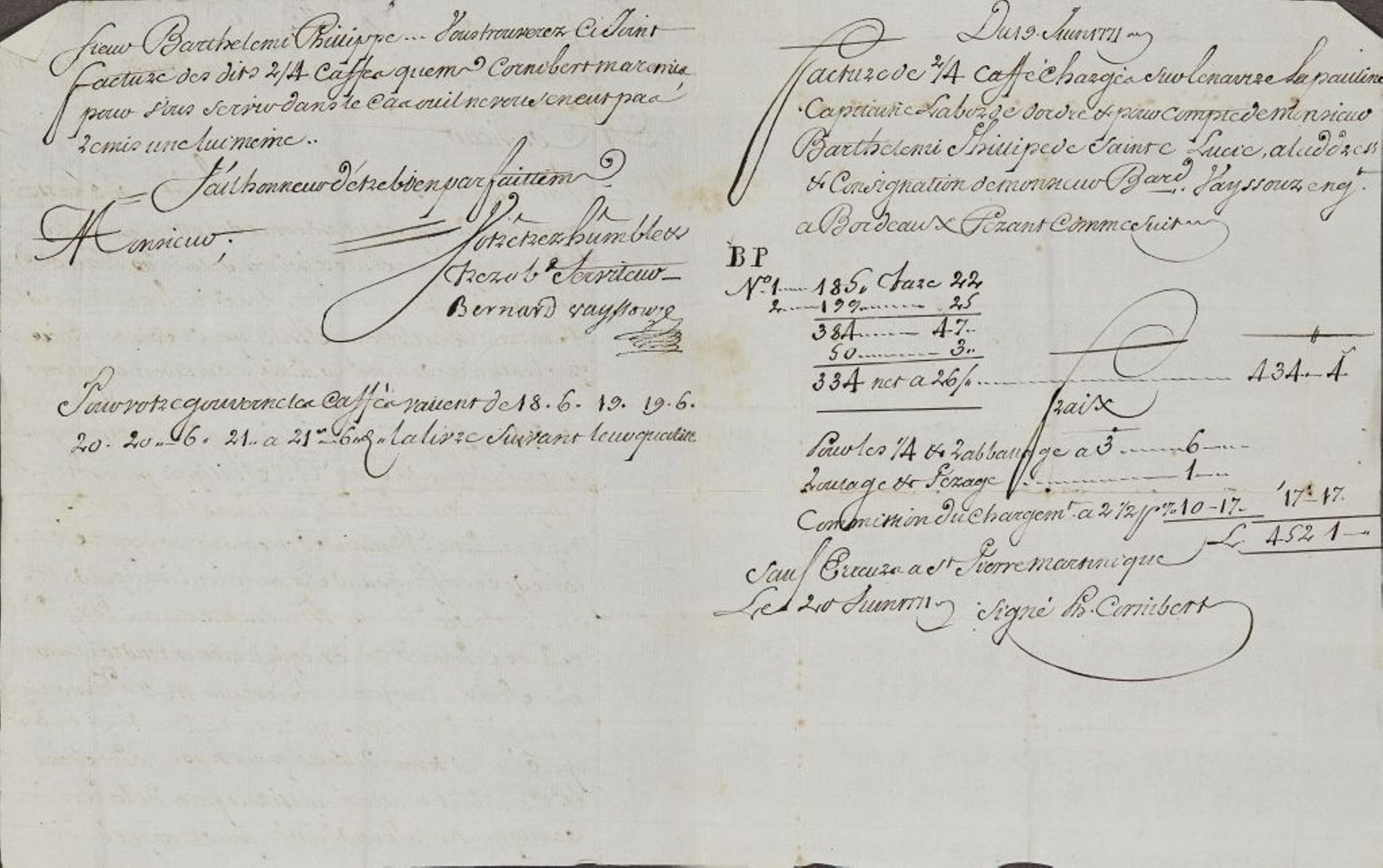 Barthélemy Philippe a fait expédier du café de Sainte-Lucie, par l’intermédiaire d'un négociant de Saint-Pierre de Martinique, à Bordeaux. Le café a été chargé à bord du navire La Pauline. Ce document permet d'évaluer les frais nécessaires au transport.