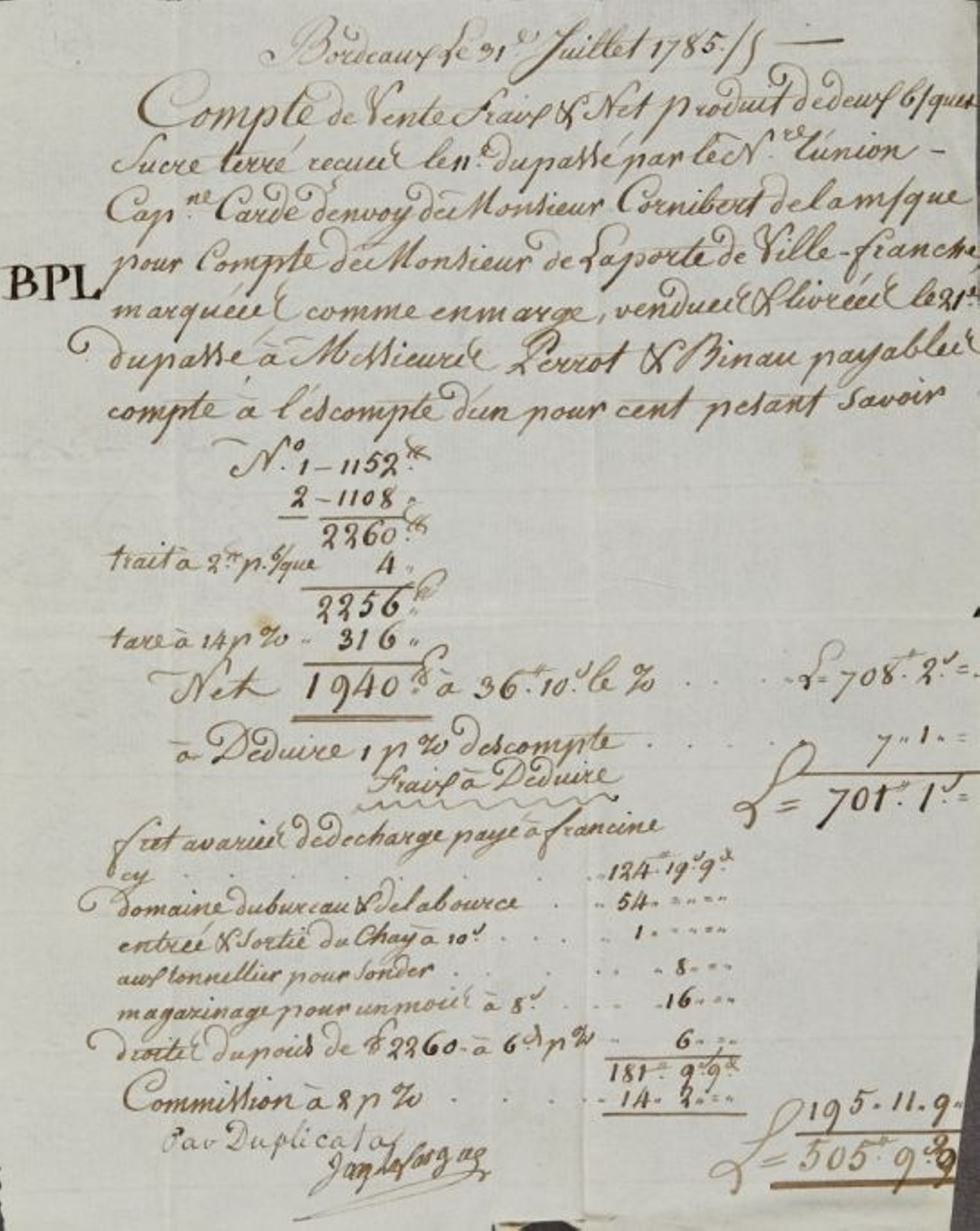 - un compte de vente de sucre réalisé à Bordeaux du 31 juillet 1785