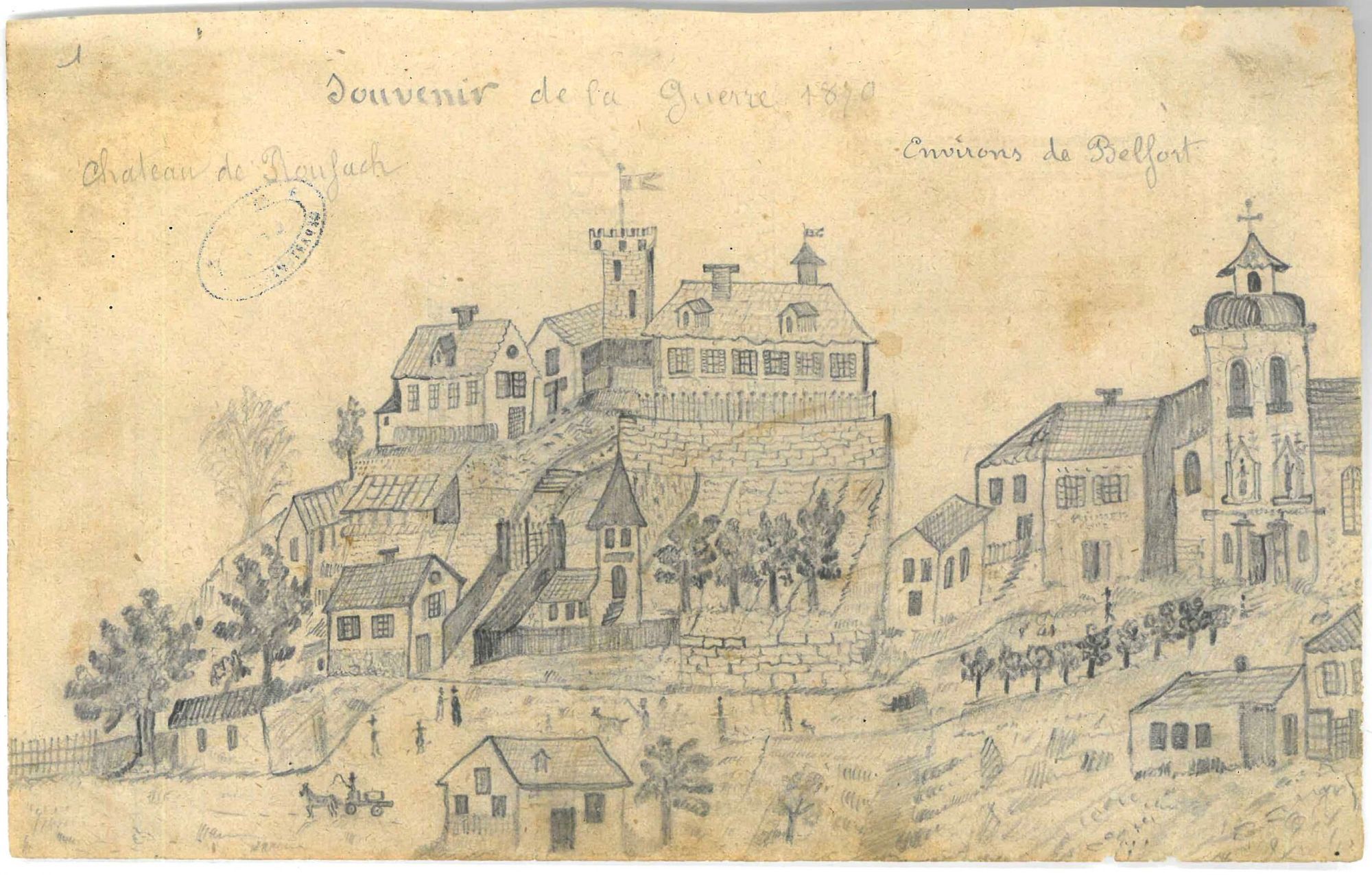 A gauche, il représente le château d’Isenbourg et, à droite, ce qui semble être l’ancien hôtel de ville avec la Tour dite des sorcières. Il est annoté : Souvenir de la guerre de 1870, environs de Belfort. Aucune information complémentaire sur son auteur n’est mentionnée. Ce dessin est sans doute le fruit de la capture fugace d’un souvenir de campagne d’un soldat en Alsace, collecté postérieurement par le docteur Cabanès.