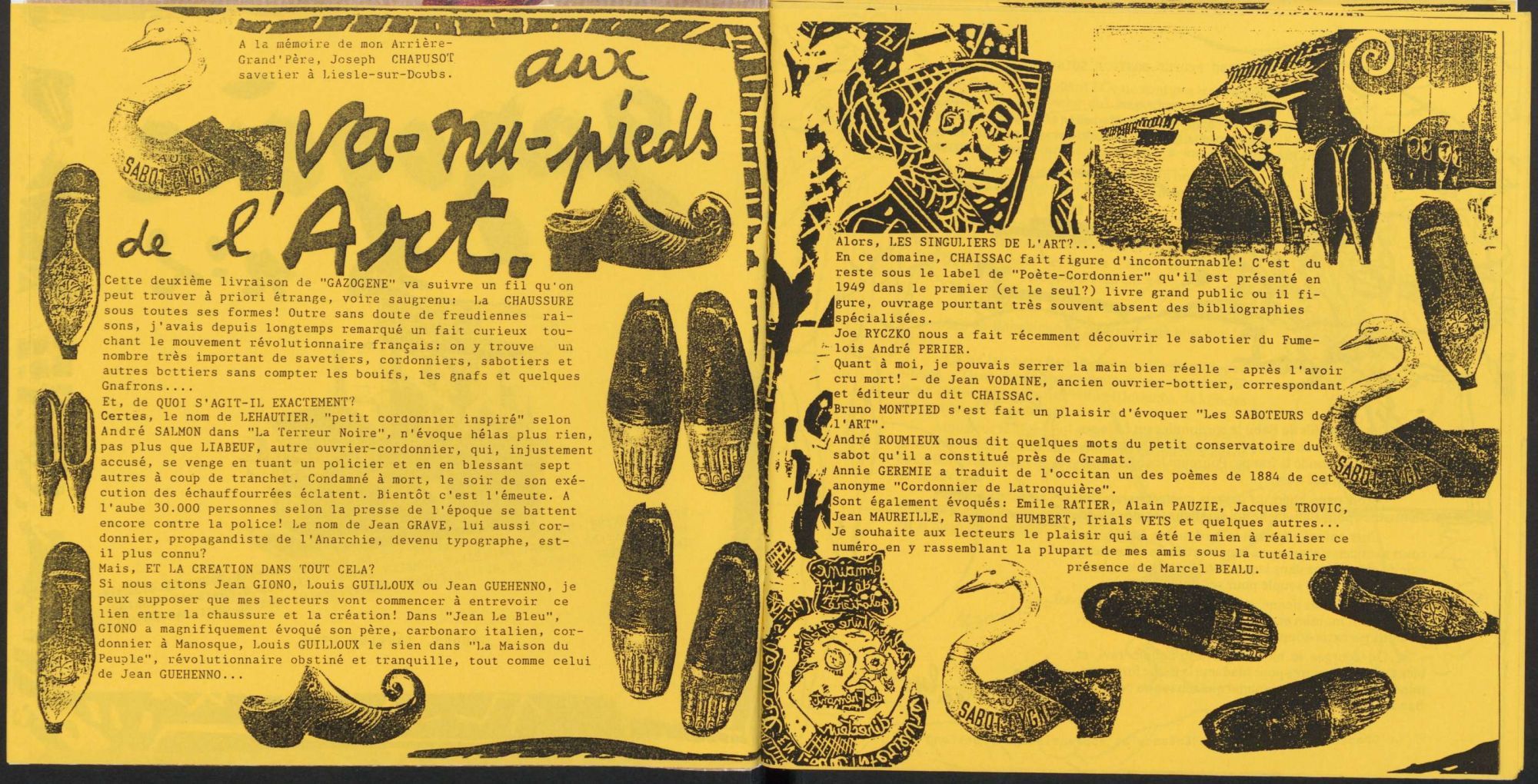 C’est du moins ce qu’annonce le 1er numéro du fanzine tiré à 30 exemplaires*. Gazogène - « la plus petite revue du monde, diffusée dans le monde entier » - propose une « ballade subjective et hédoniste à la rencontre de sites et de personnages mal ou peu connus, pour ne pas dire inconnus » cf. n° 3. L’objectif de Jean-François Maurice est à nouveau clairement revendiqué dans le n° 6 : « dresser une carte subjective, affective et passionnelle, en un mot "poétique", du territoire de la création singulière, populaire, "brute" ». Ces « petits espaces de création populaire, vous en connaissez tous, comme vous avez tous vu ces singuliers de l’art, si proches et pourtant si lointains » explique-t-il. « Gazogène donne la parole à ceux qui en sont le plus souvent exclus, qu’ils soient peintres, sculpteurs, bâtisseurs… mais aussi conteurs, poètes, écrituristes prolétariens ou "fous littéraires" ».