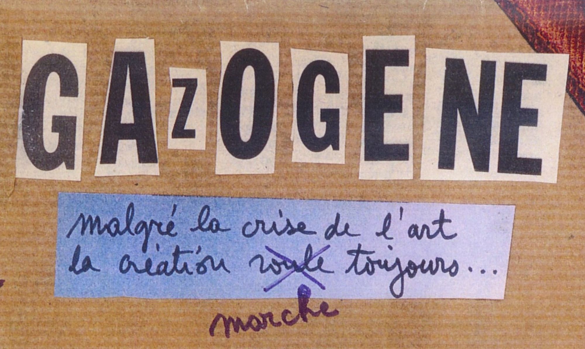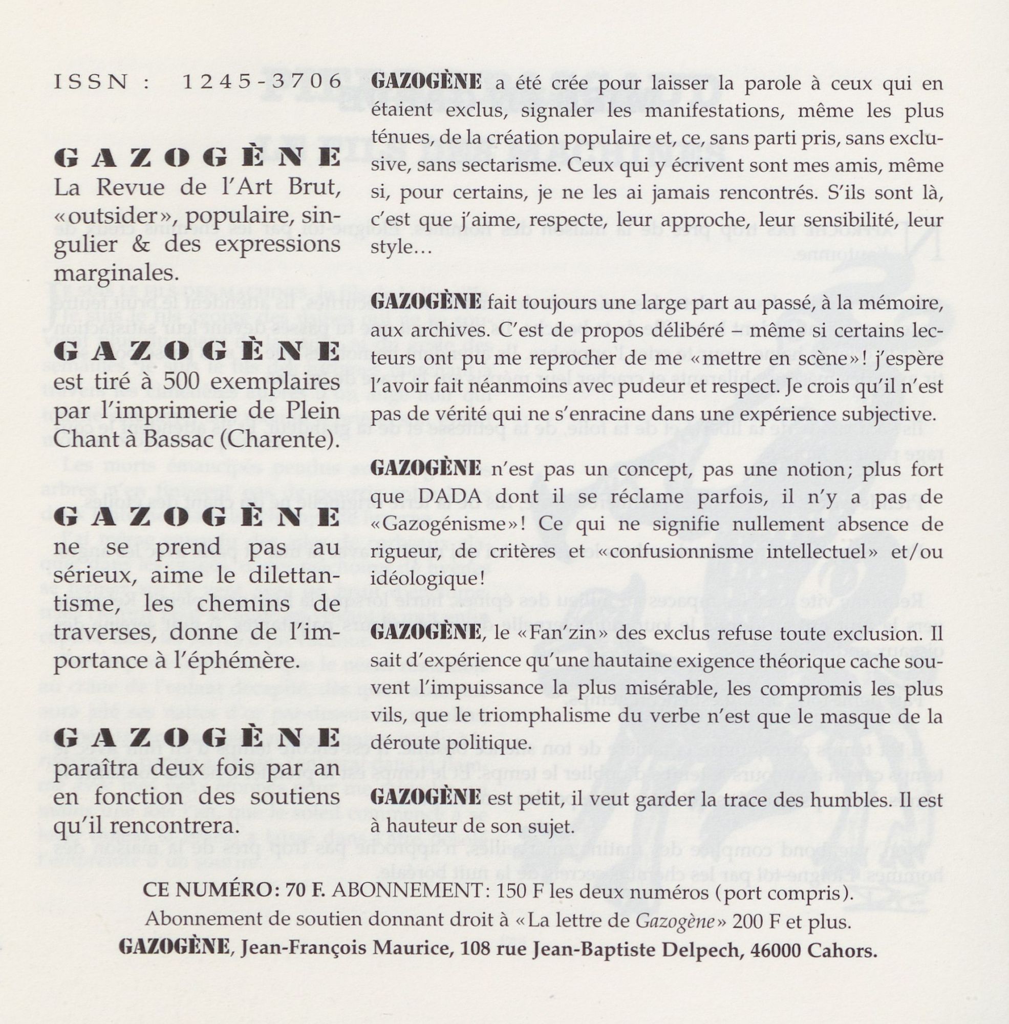 « Avec ce numéro double [29/30], Gazogène boucle sa nouvelle série. Rappelons que du n° 1 au n° 16, je l’ai réalisé seul, en totalité : chaque texte était tapé sur ma vieille machine mécanique puis, comble du luxe, électrique. Une matrice était réalisée avec dessins, photographies, illustrations diverses. Ensuite l’ensemble était photocopié chez un imprimeur qui s’appelait M. Rimbaud, cela ne s’invente pas… Comme il allait céder son affaire, j’avais accès aux différents papiers en attente. J’ai ainsi pu user et abuser de papier couleur, de carton "peau d’éléphant" et des premières photocopies couleur. Ensuite, tout était fait à la main : classement, pliage, encartage, piquage car M. Rimbaud poussait la complaisance jusqu’à me prêter l’agrafeuse électrique de l’imprimerie […]. La revue tirée, il me fallait contre-coller les images couleur, cartes postales, enveloppes contenant lettres en fac-similé, affichettes et autres bizarreries […]. Puis ce fut le tournant. Nicole et Claude Detourbes – ce dernier aujourd’hui hélas disparu – organisèrent dans leur librairie Calligramme à Cahors une exposition consacrée à l’Art Brut. Le n° 16 de la revue devait servir de catalogue, me voici réalisant plus de 300 exemplaires ! Pari tenu. Mais la contrainte l’avait emporté sur le plaisir. A quelques temps de là, passant par Brassac, en Charente, je m’arrêtai aux éditions Plein Chant […]. Une nouvelle aventure commençait. Elle s’achève, sous cette forme, avec ce numéro. Un autre cycle va naître ».