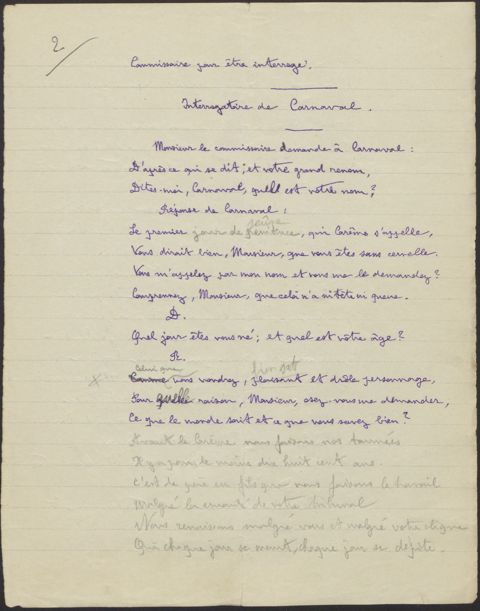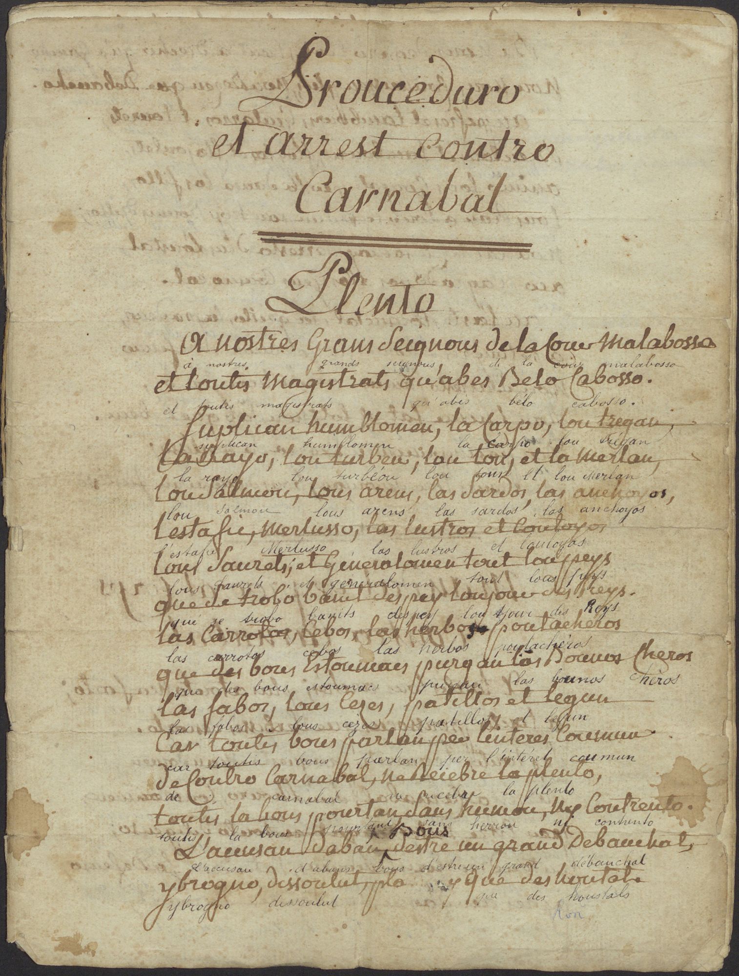 Parmi les papiers de famille isolés, on peut trouver sous la cote 89 J 118, voisinant avec un pamphlet satyrique contre l’Empire, un jugement de carnaval, sans date, couché sur un cahier de réemploi. Rayé, le cahier porte au dos un titre : « Délibération du 2 mars 1775 ». Le texte a donc été rédigé après cette date, soit vraisemblablement dans le dernier tiers du XVIIIe siècle.