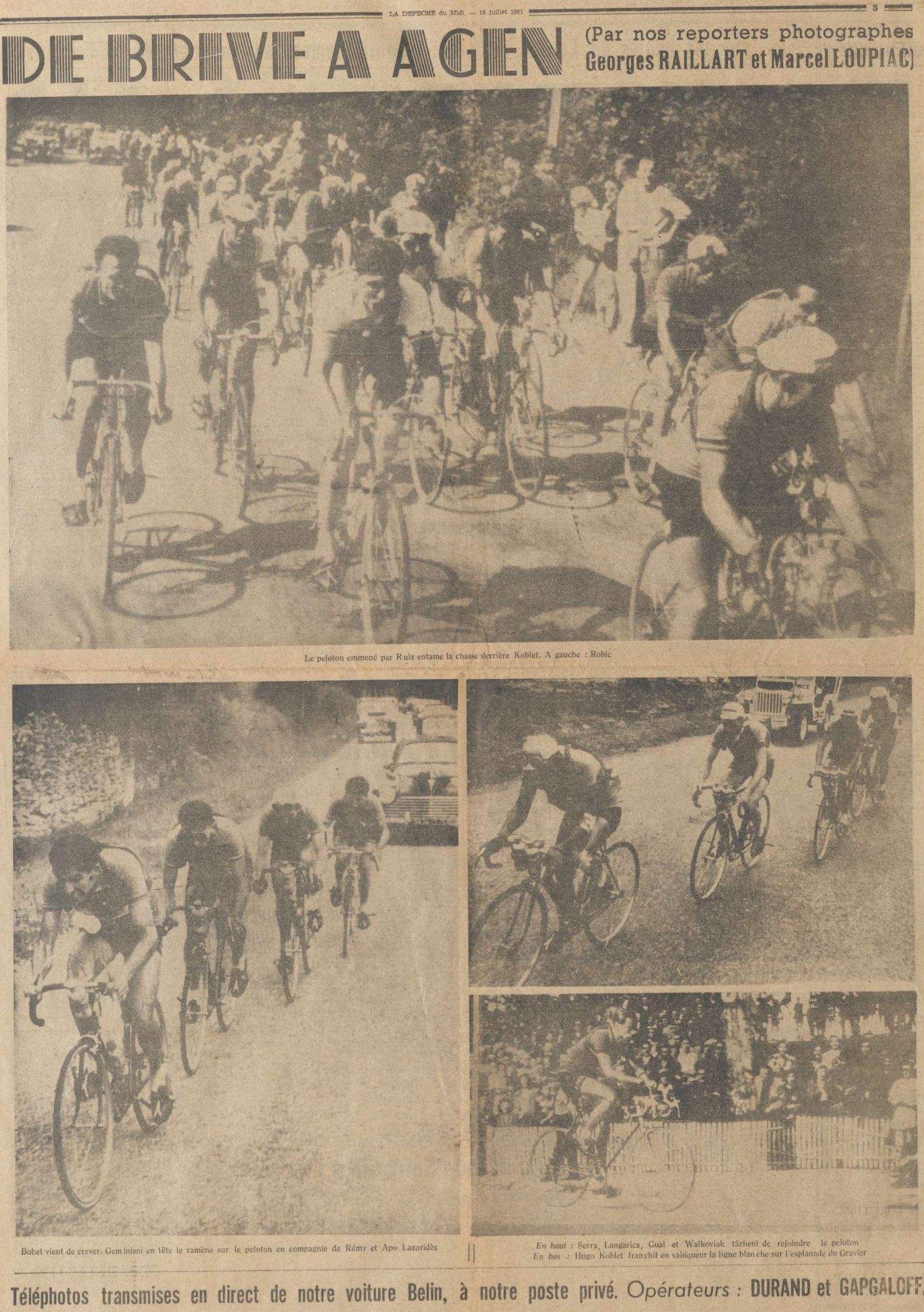 Sitôt franchi la rivière Dordogne, c’est à Lanzac très précisément qu’Hugo Koblet se détache d’un peloton nerveux, en compagnie du modeste Louis Deprez qui ne restera collé dans son sillage que durant quelques kilomètres.
