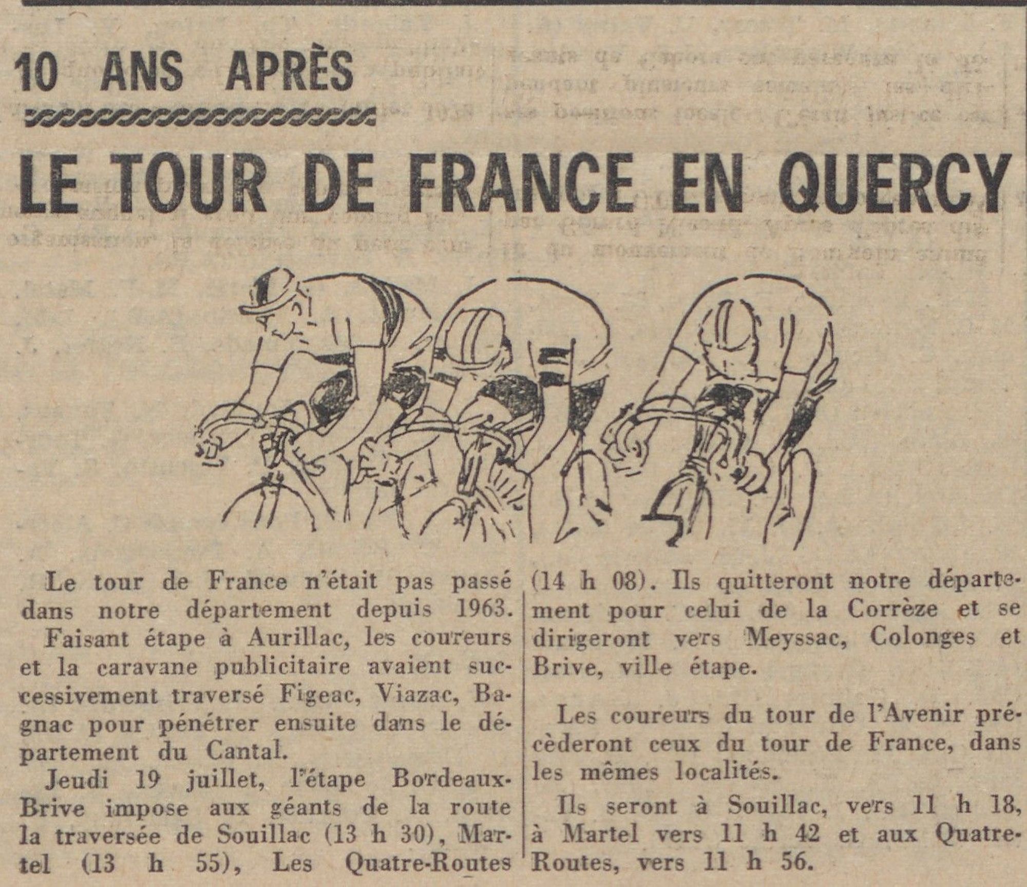 Je vous propose de conter à ma façon les quinze rencontres du Lot avec la grande épreuve. Vous y revivrez quelques événements marquants : 1951, 1976, 2004. D’autres années, moins connues, méritent tout de même un petit commentaire ! Vous serez sans doute étonnés de la prédominance d’une date lotoise pour la grande histoire du Tour : le 15 juillet.
