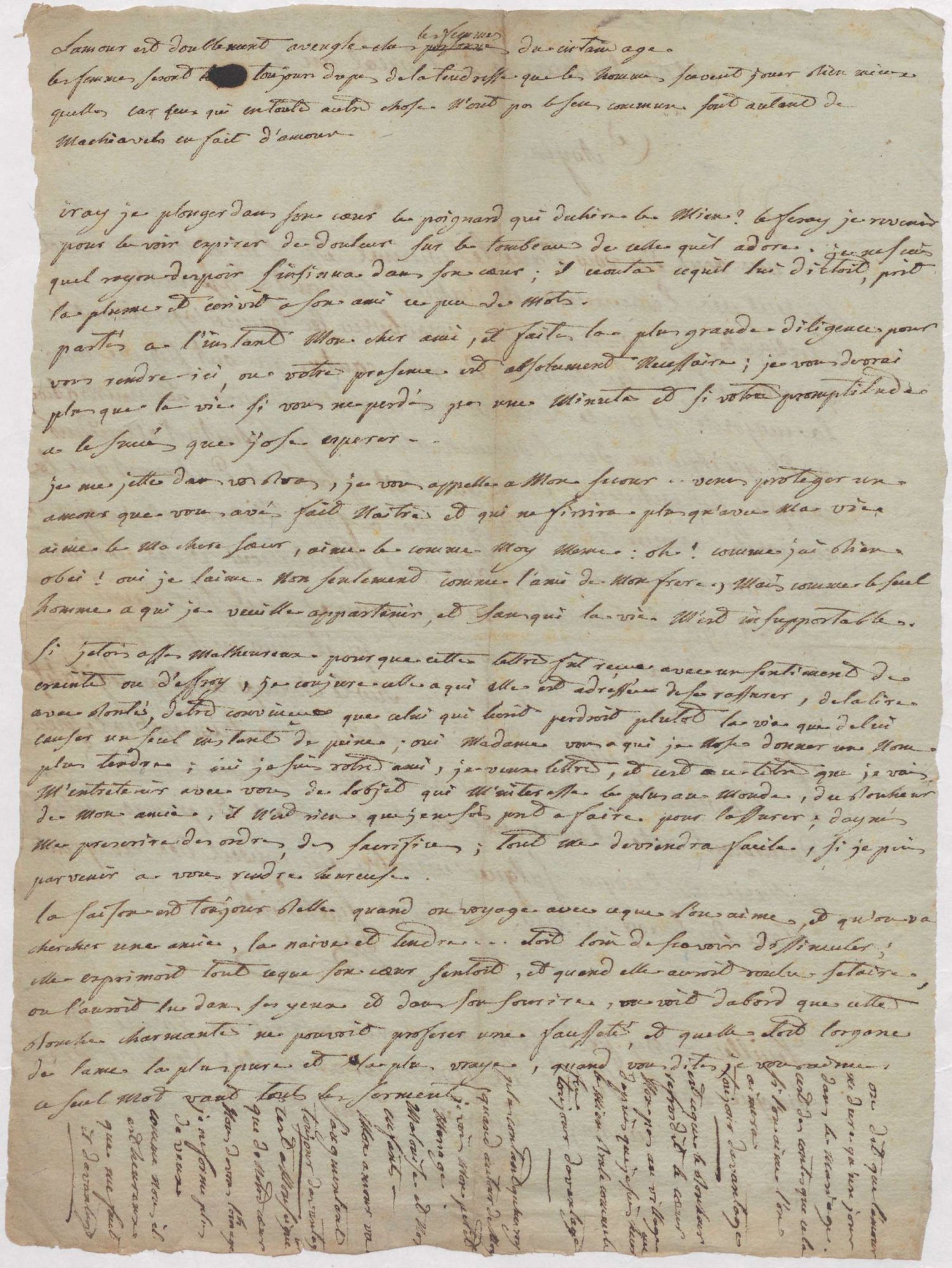 Si j’étois assez malheureux pour que cette lettre fut reçue avec un sentiment de crainte ou d’effroy, je conjure celle à qui elle est adressée de se rassurer, de la lire avec bonté, d’être convaincue que celui qui liroit, perdroit plutôt la vie que de lui causer un seul instant de la peine ; oui, madame vous à que je n’ose donner un nom plus tendre ; oui je suis votre ami, je veux l’etre, et c’est à ce titre que je vais m’entretenir avec vous de l’objet qui m’intéresse le plus au monde, du bonheur de mon amie, il n’est rien que je ne suis prêt à faire pour l’assurer ; daignez me prescrire des ordres, des sacrifices ; tout me deviendra facile, si je puis parvenir à vous rendre heureuse.
