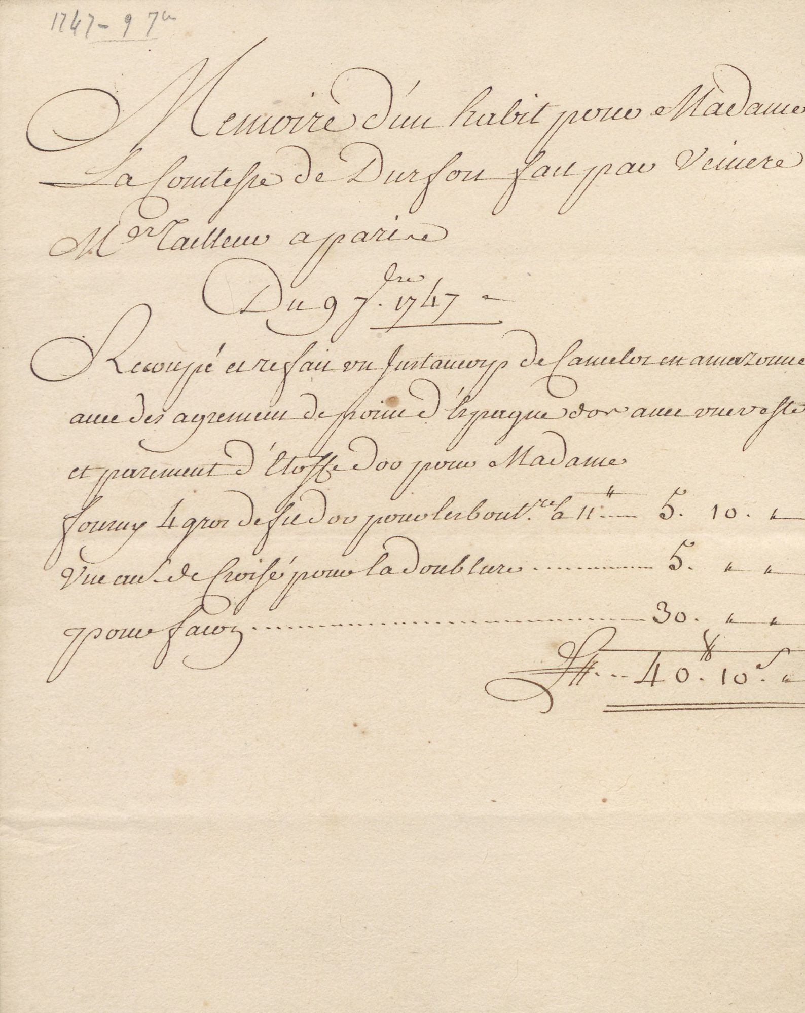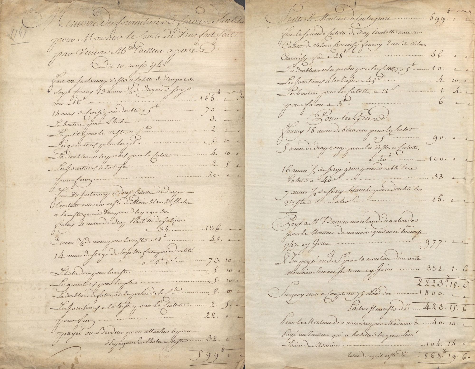 Dans ces papiers, le hasard a bien voulu nous faire connaitre les « mémoires » (factures) des achats du couple de Durfort entre le 10 août et 9 septembre 1747, principalement consacrés à leur habillement, ainsi qu’à celui de leur domesticité.