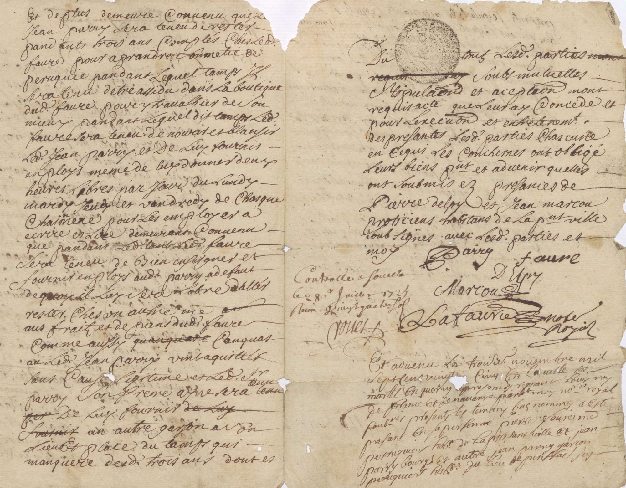 Ce jourd’huy quatorzième jour du mois de juillet mil sept cens vingt cinq en la ville de Martel en Quercy après midy, régnant Louis roy de France et de Navarre, pardevant moy notaire royal soubssigné, present les temoints bas nommés, a esté présent en sa personne Jean Parry, bourgeois, habitant du lieu de Pinssac, lequel de gré a bailhé en aprantisage Jean Parri son frère à Pierre Faure, maître preruquier [qui fait des perruques, mais surtout qui coiffe et rase] habitant de la présent ville icy présent, stipulant et accpeptant pour luy aprandre le métier de peruquier et arager [sic] de tout son possible sans luy rien cacher, pour raison de quoy ledit sieur Parry sera tenu de bailher audit sieur Faure la somme de cent vingt livres quatre cartons de saigle et froment, un quartons de pois rouge, ensamble la somme de cinq livres pour l’étrène de la famme dudit Faure, payable sçavoir le bled et poids et la somme de quar[a]nte livres à la Décollation Saint-Jean [décapitation de Saint Jean Baptiste, 29 août] prochains venant et les quatre vingt cinq livres restant dans trois ans à conter de cejaurd’huy ; et de plus demeure convenu que ledit Jean Parry sera teneu de rester pandants trois ans complés chés ledit Faure pour aprandre son métié de péruquié, pandant lequel tamps il sera tenu d’être assidu dans la boutique dudit Faure pour y travalhier de son mieux, pandant lequel dit tamps ledit Faure sera teneu de nourrir et blansir ledit Jean Parry et de luy fournir enploys, même de luy donner deux heures libres par jour du lundy, mardy, jeudy et vandredy de chasque chaimène pour les employer à écrire et lire, demeurant convenu que pandant ledit tant, ledit Faure sera teneu de bien enseigner et fournir enploys audit Parry, à défaut de quoy il luy seré libre d’aller rester chés un autre maître aus fraits et dépans dudit Faure ; comme aussy c’anquas où ledit Jean Parry vint à quitter sans cause légitime et ledit sieur Parry son frère ayné sera tenu de luy fournir un autre garson à son lieu et place, du tamps qui manqueré desdits trois ans, dont et du toutz lesdites parties, soubs mutuelles stipulation et aceptation, m’ont requis acte, que leur ay concédé et pour l’exécution et entretènemen [suivi de l’acte] des présantes, lesdites parties chascune en ce qui les conchernes ont obligé leurs biens présent et advenir, qu’elles ont soubmis ez présances de Pierre Delpy et Jean Marcou praticiens, habitans de la présent ville, soubsignés avec lesdites parties et moy