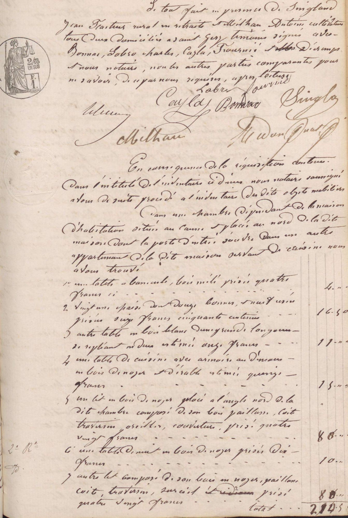 De son côté, Marie Marty, veuve Labro, déclare réclamer comme sa propriété le mobilier porté dans l’inventaire du 11 septembre 1829 enregistré au sujet duquel elle fait toutes réserves à l’exception du lot qui y est porté qu’elle déclare avoir reçu dont elle donne décharge à ses enfants.