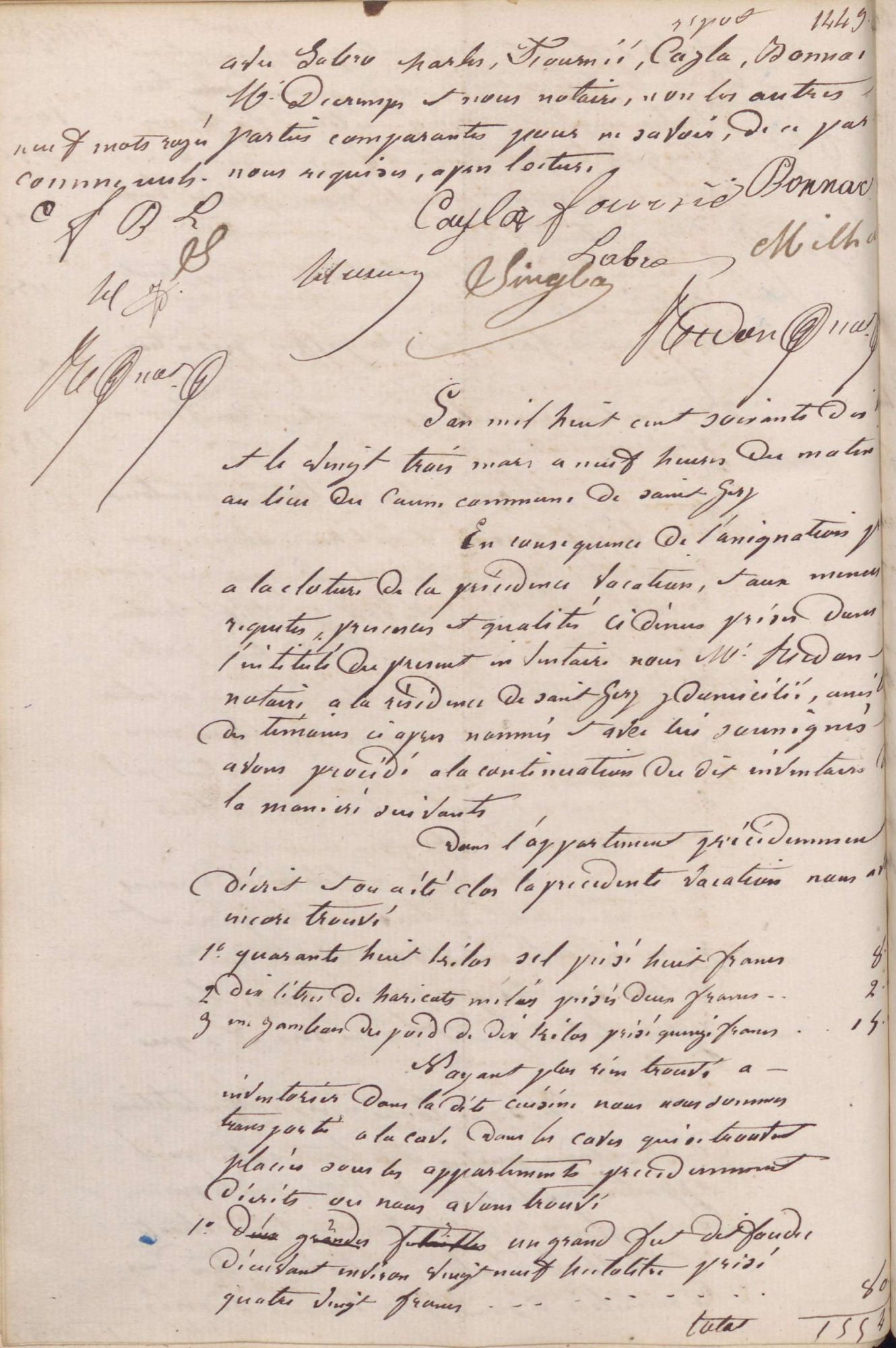 N’ayant plus rien à porter et faire comprendre au présent inventaire, nous l’avons clos après avoir vaqué de 9 h. du matin à 6 h. du soir par triple vacation.