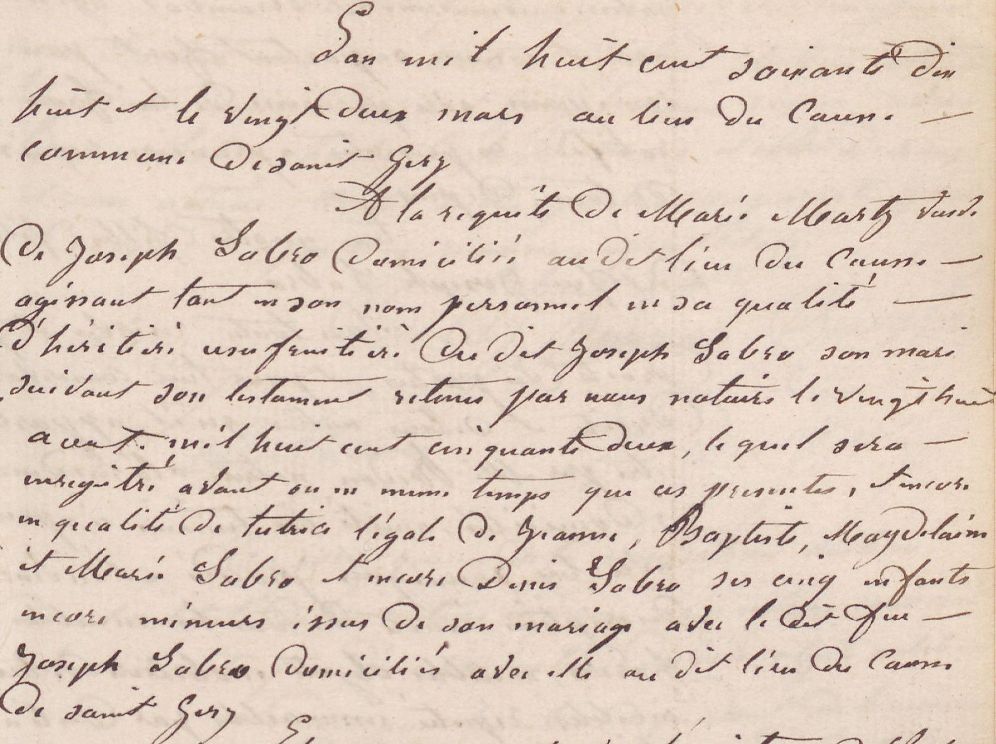 A la requête de Marie Marty, veuve de Joseph Labro, domiciliée au dit lieu du Causse, agissant tant en son nom personnel en sa qualité d’héritière dudit Joseph Labro son mari suivant son testament retenu par nous notaire le 28 août 1852, et encore en qualité de tutrice légale de Jeanne [sic], Baptiste, Magdelaine et Marie Labro et encore Denis Labro, ses cinq enfants encore mineurs issus de son mariage avec ledit Joseph Labro