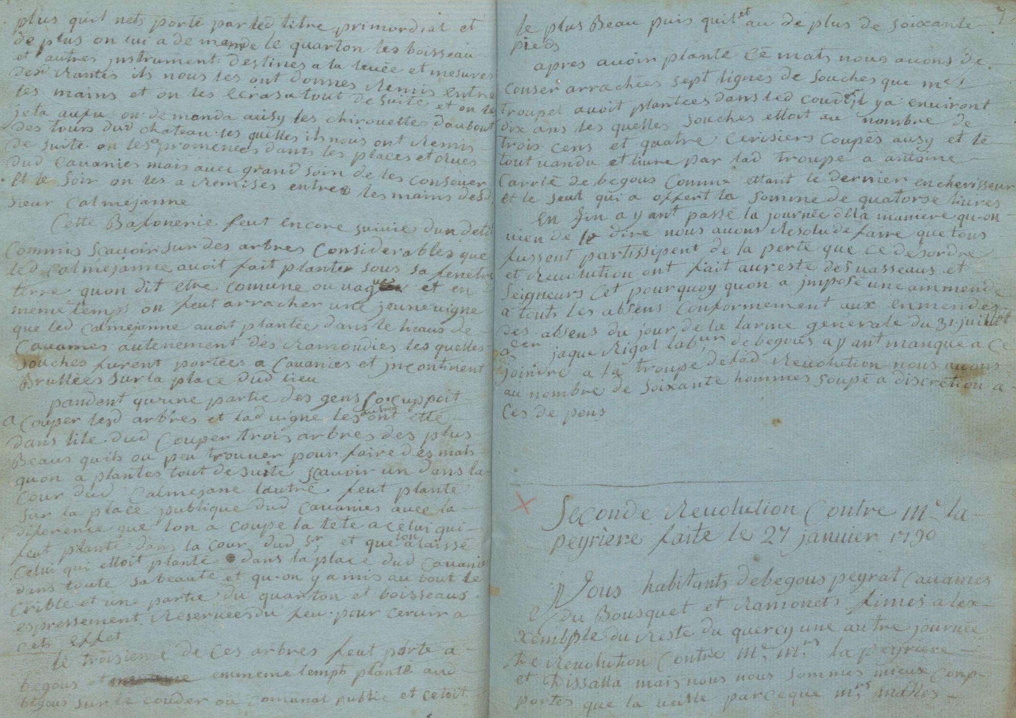 L’an 1790, le 26 du mois de janvier, nous habitants de Bégous, Peyrat et Cavaniès avons fait une révolution contre Me Calméjanne, seigneur de Cavaniès, ou pour mieux dire possesseur de quelque quarte de bled de rente que les susdits lui payoit. Nous nous sommes assemblés au nombre de cent personnes ou environt, armés de toute sorte d’armes offensives et defencives, comme fusils, épées, couteaus de chasse, aches, pioches, pelles et fourches de fer, gros bâtons pointus ou ferrés, et marchant sur deux rangs jusques à nous introduire dans le château dudit Calméjanne au lieu de Cavaniès*. Tout de suite la demoiselle, femme dudit, avec sa famille, nous ont salués et reçus avec beaucoup de courtoisie. D’abord ils nous donnoirent du pain et du vin à discrétion et, apprès avoir mangé et boüeu, on leur a demandé la vérification du titre primordial, sous promesse de le ramplir si on ne le ramplit pas par ce qui et porté par la dernière reconnoissance, et nous demendons en même temps ce qu’il peut avoir reçu de plus qu’il n’ets porté par ledit titre primordial, et de plus, on lui a demandé le quarton, les boisseau et autres instruments destinées à la levée et mesures desdites rantes. Ils nous les ont données, remis entre les mains et on les écrasa tout de suite et on les jeta au feu. On demanda ausy les chirouettes d’au bout des tours dudit château, lesquels ils nous ont remis de suite. On les a promenés dans les places et rues dudit Cavaniès, mais avec grand soin de les conserver, et le soir on les a remises entre les mains desdit sieur Calméjanne. Cette boufonerie feut encore suivie d’un délit commis, sçavoir sur des arbres considérables que ledit Calméajnne avoit fait planter sous sa fenêtre, terre qu’on dit être comune ou vagues, et en même temps on feut arracher une jeune vigne que ledit Calméjanne avoit plantée dans le heaus de Cavaniès, au tènement des Ramondies ; lesquelles souches furent portées à Cavaniès et incontinent brullées sur la place dudit lieu.