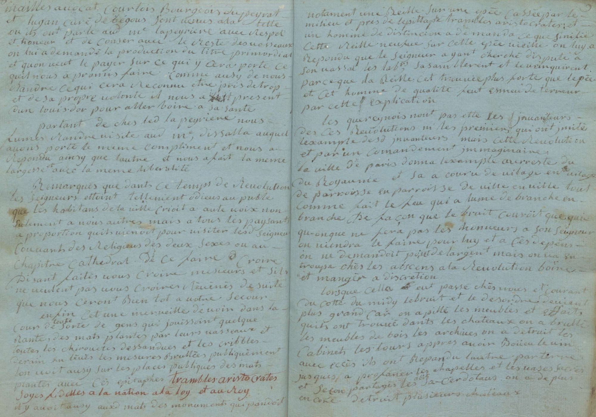 Les quercynois n’ont pas etté les invanteurs de ces révolutions, ni les premiers qui ont imité l’example desdits invanteurs, mais cette révolution et par un comandement immaginaire. La ville de Paris donna l’example au reste du royaume et sa a couru de vilage en vilage, de paroisse en paroisse, de ville en ville, tout comme fait le feut qui alume de branche en branche, de façon que le bruit couroït que quiconque ne fera pas les honneurs à son seigneur, on viendra le faire pour luy et à ces dépens. On ne demandoit point de l’argent, mais on va en troupe chés les abscens à la révolution boire et manger à discrétion.