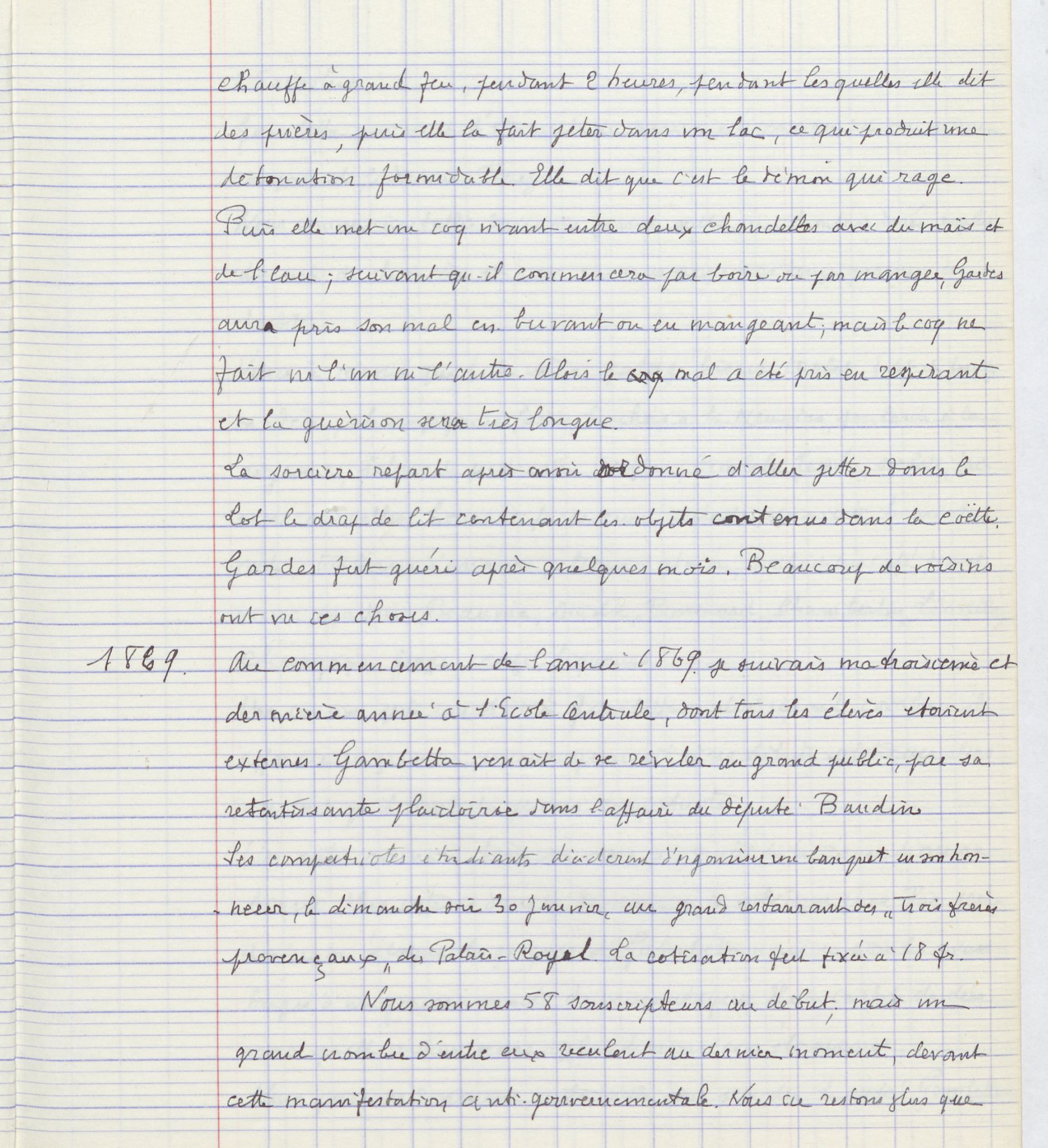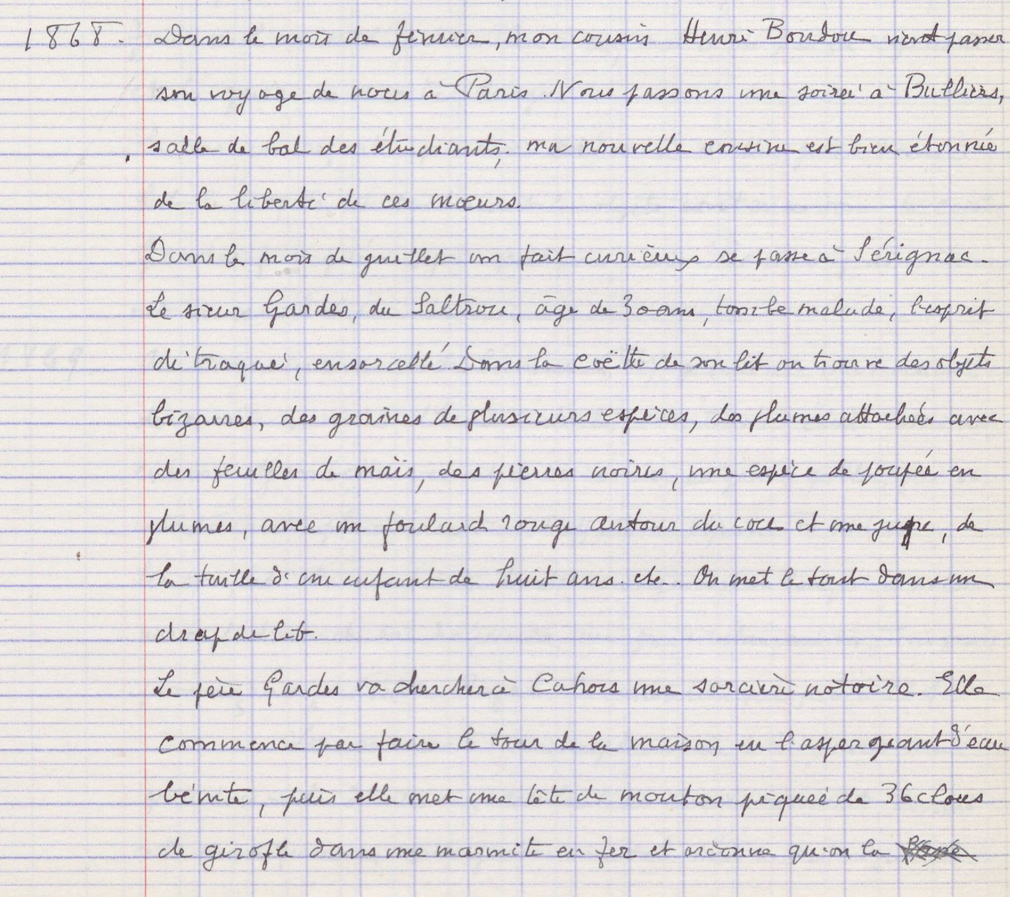 autour du cou et une jupe, de la taille d’un enfant de huit ans, etc. On met le tout dans un drap de lit. Le père Gardes va chercher à Cahors une sorcière notoire. Elle commence par faire le tour de la maison en l’aspergeant d’eau bénite, puis elle met une tête de mouton piquée de 36 clous de girofle dans une marmite en fer et ordonne qu’on la chauffe à grand feu, pendant deux heures, pendant lesquelles elle dit des prières, puis elle la fait jeter dans un lac, ce qui produit une détonation formidable. Elle dit que c’est le démon qui rage. Puis elle met un coq vivant entre deux chandelles avec du maïs et de l’eau ; suivant qu’il commencera par boire ou par manger, Gardes aura pris son mal en buvant ou en mangeant, mais le coq ne fait ni l’un, ni l’autre. Alors le mal a été pris en respirant et la guérison sera très longue. La sorcière repart après avoir ordonné d’aller jeter dans le Lot le drap de lit contenant les objets contenus dans la coëtte. Gardes fut guéri après quelques mois. Beaucoup de voisins ont vu ces choses. »
