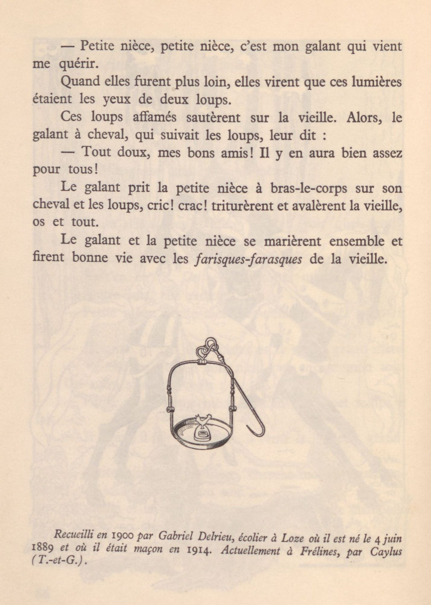 Le galant prit la petite nièce à bras le corps sur son cheval, et les loups, cric, crac, triturèrent et avalèrent la vieille, os et tout.