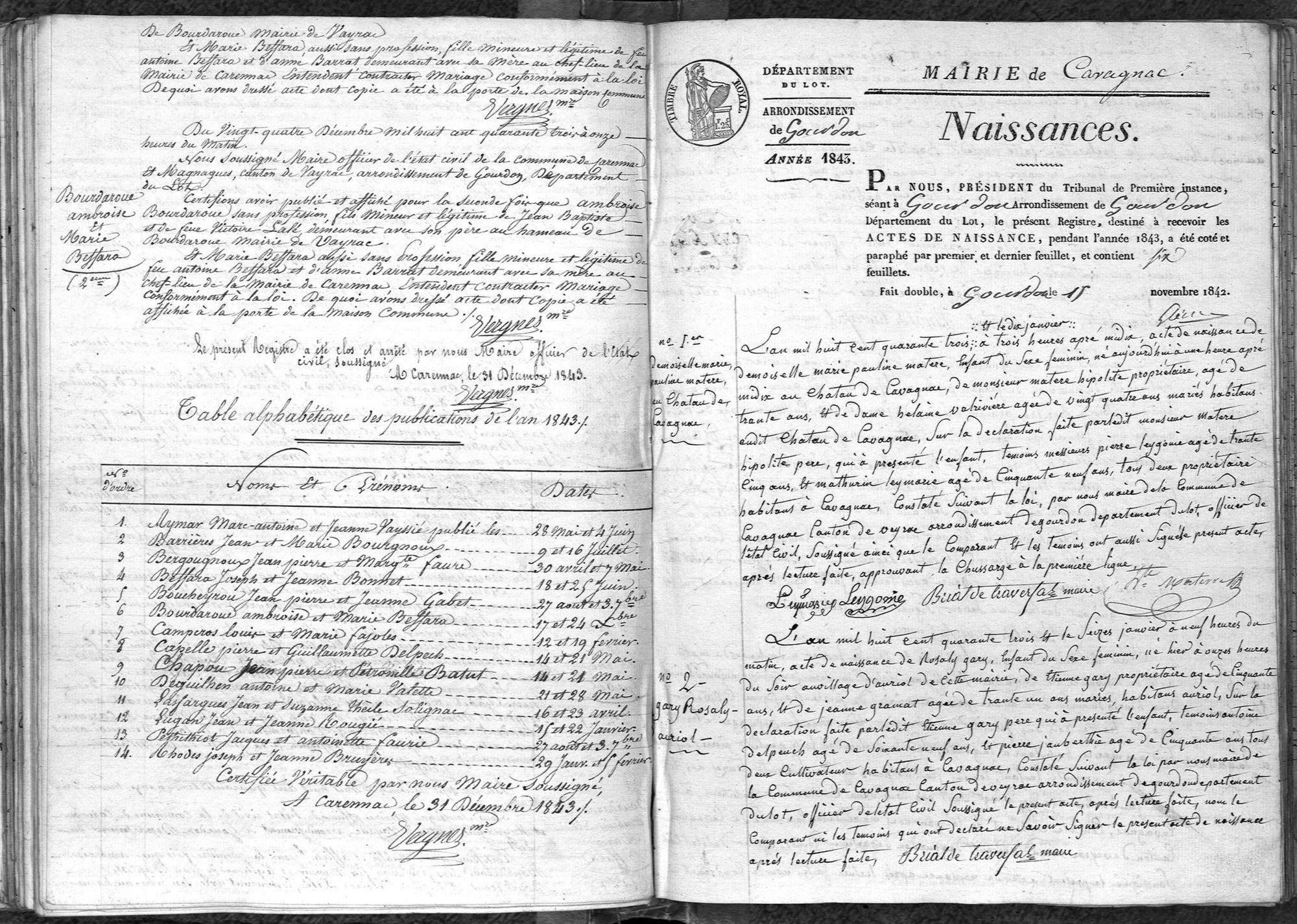 Commune Cavagnac Description 1843 (naissances) Cote 4 E 2904 Ark name https://archives.lot.fr:443/ark:77978/s005b81714d0a0aa.moteur=arko_default_67ebab2c7f97d