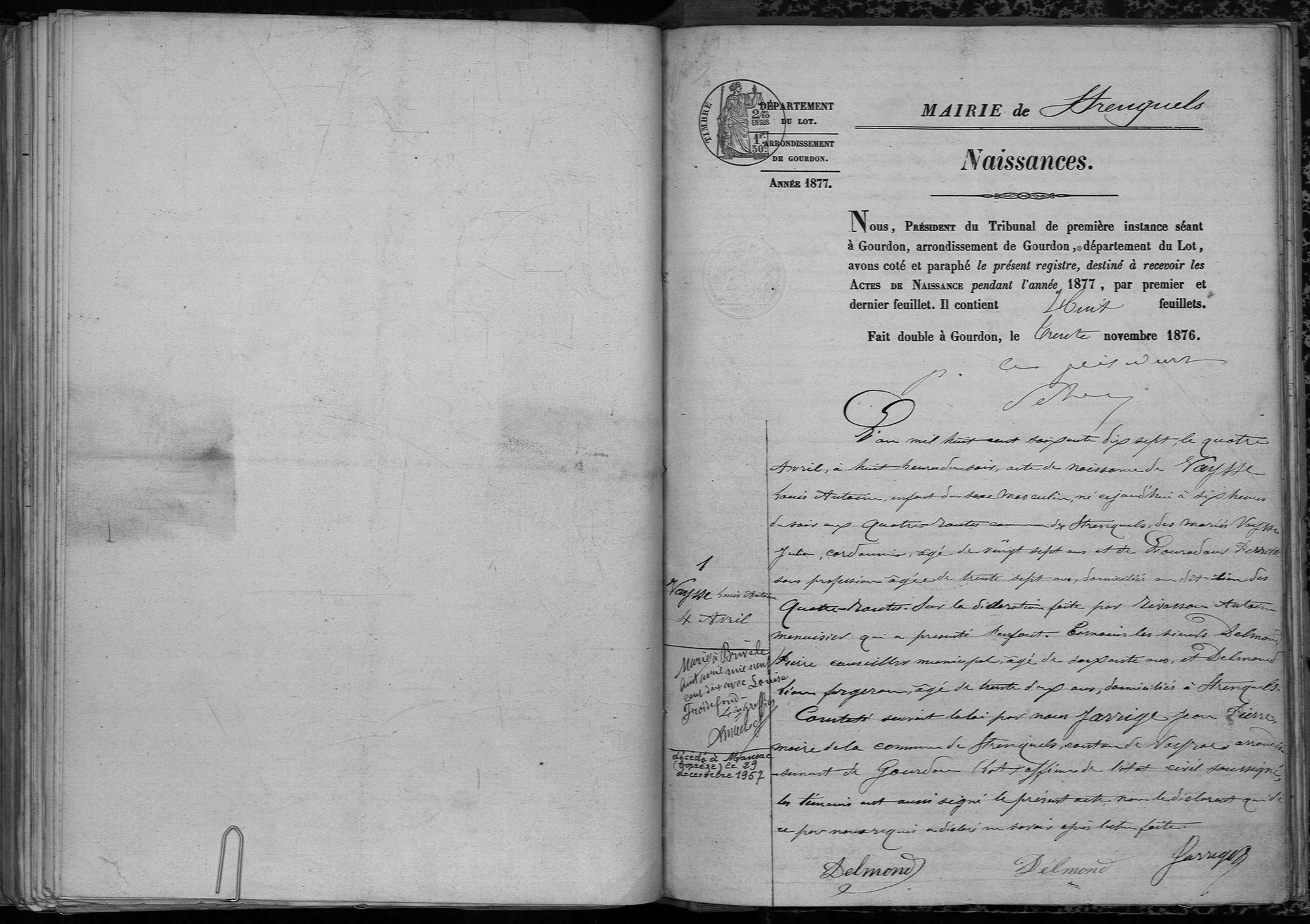 Commune Strenquels Description 1877 (naissances) Cote 4 E 2938 Ark name https://archives.lot.fr:443/ark:77978/s005b61cf504585c.moteur=arko_default_67ebab2c7f97d