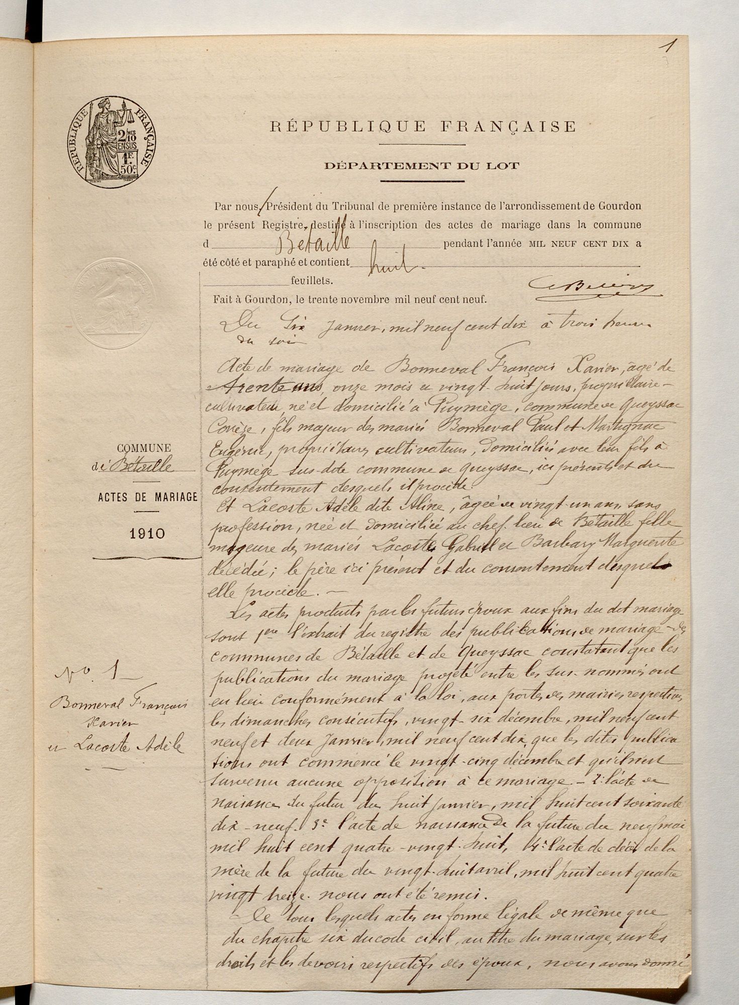 Commune Bétaille Description 1910 (mariages) Cote 4 E 4412 Ark name https://archives.lot.fr:443/ark:77978/s005fe9ab7ff0d77.moteur=arko_default_67ebab2c7f97d