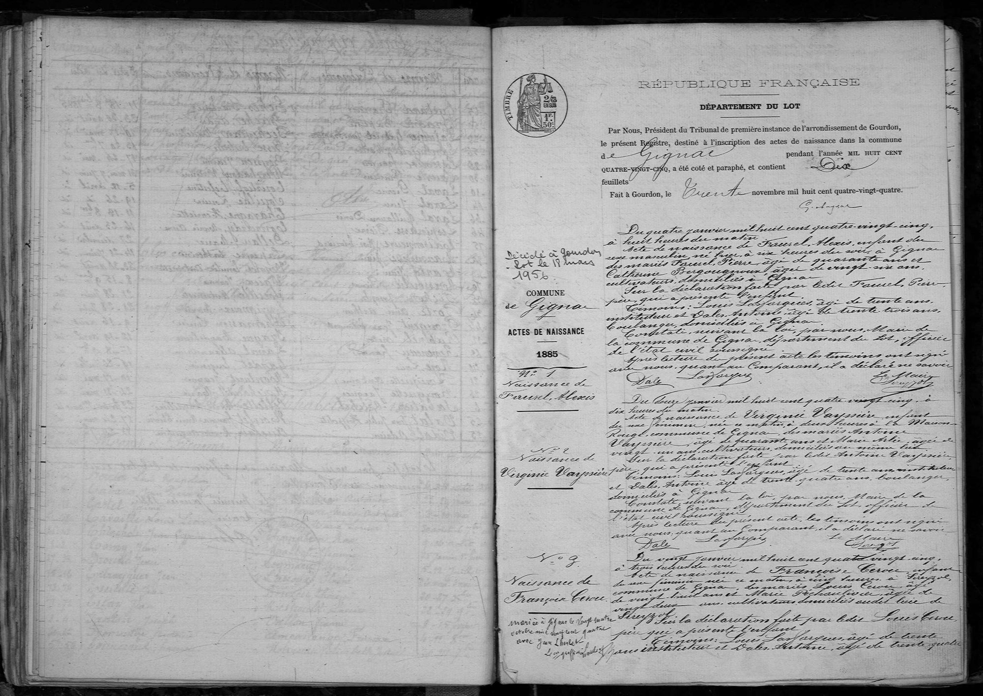 Commune Gignac Description 1885 (naissances) Cote 4 E 2768 Ark name https://archives.lot.fr:443/ark:77978/s005b4f101803494.moteur=arko_default_67ebab2c7f97d