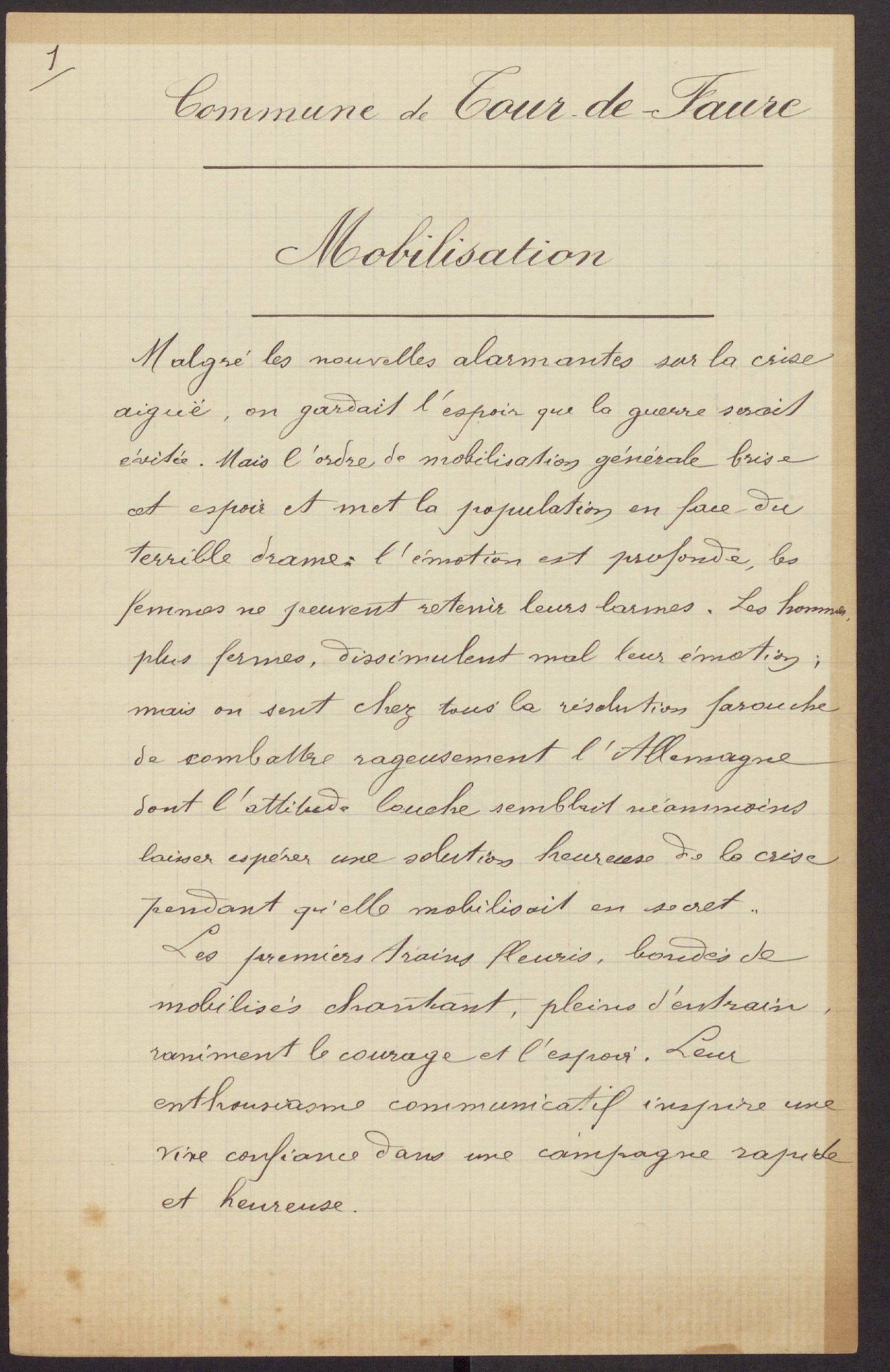 Les documents de ce dossier dévoilent les répercussions engendrées par la guerre dans le Lot pour les civils restés au pays. Dès l’annonce de la mobilisation du 1er août 1914, la société lotoise est bouleversée. Tandis que les hommes quittent les campagnes pour rejoindre le régiment auquel ils sont affectés, les femmes, les enfants et les vieillards doivent assurer le quotidien, poursuivre les travaux des champs indispensables à la vie de la communauté villageoise. Il s’agit d’affronter une situation nouvelle. Tous ces changements du quotidien sont évoqués, racontés par les instituteurs, témoins directs de la vie au village, et enrichis par le rapport journalier du préfet du Lot, rédigé dès le premier mois de la guerre. A cela, nous avons ajouté des documents officiels émanant du ministère de l’Intérieur et de celui de la Guerre. Le croisement de ces sources montre comment les Lotois abordent les premiers moments de la guerre.