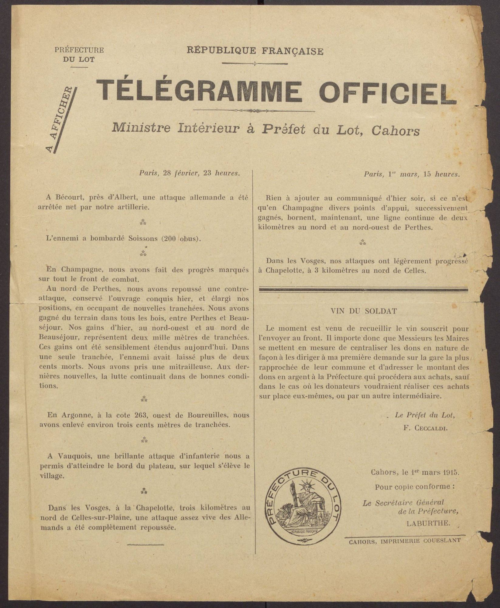 | Documents utilisés à télécharger ci-contre | Notes communales manuscrites de l’institutrice de Frayssinhes, datées du 24 mai 1915 Notes communales manuscrites de l’instituteur de Tour-de-Faure, envoyées le 28 avril 1916. Rapport journalier manuscrit du préfet François Ceccaldi sur la situation du département du Lot au début de la Première Guerre mondiale, pour la période du 2 août au 3 septembre 1914. Télégramme du ministre de l’Intérieur adressé au préfet du Lot le 1er mars 1915. Courrier du Ministère de la guerre daté du 25 février 1915 concernant les réquisitions de blé. |